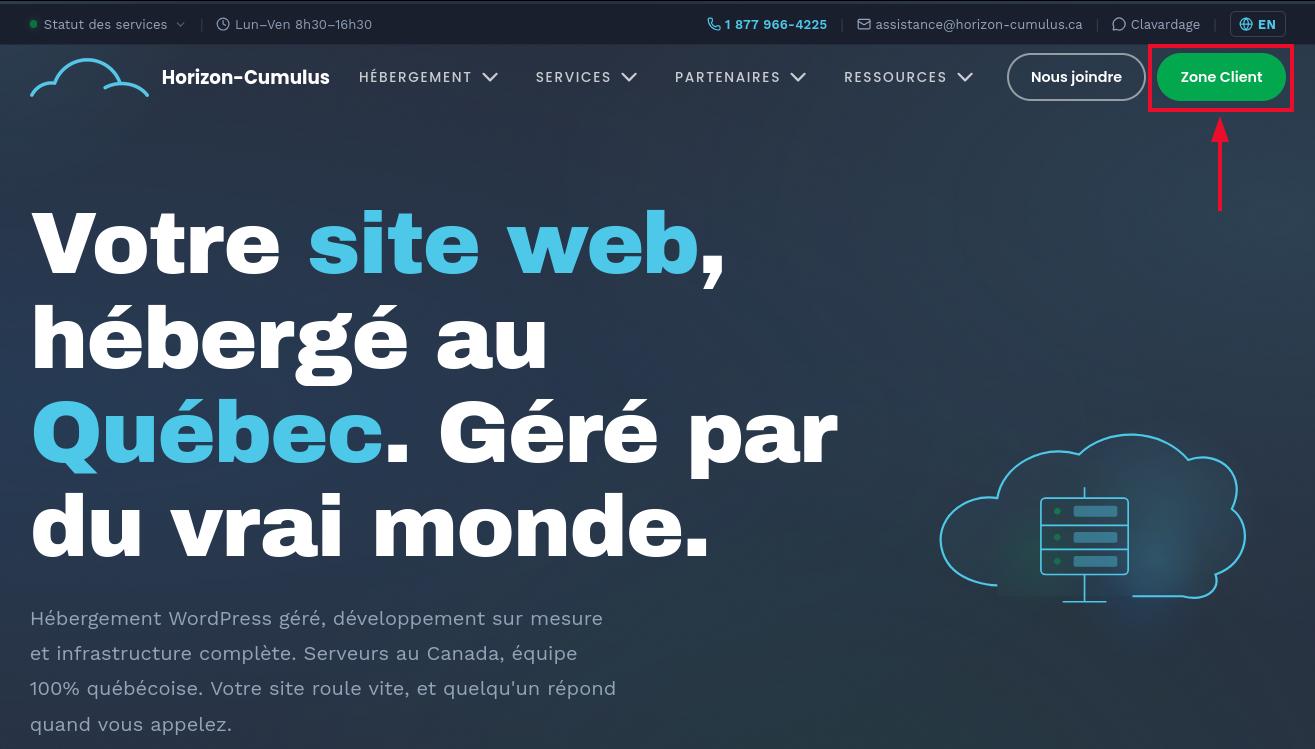Appuyez sur le bouton "Accéder à votre espace client" en haut à droite de la page principale de Horizon Cumulus.